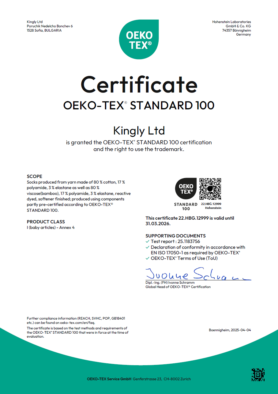Awarded to textile production facilities that demonstrate outstanding environmental performance, social responsibility, and safety standards. Level 3 is the highest level possible, indicating that Kingly uses exemplary best practices in chemical management, workplace safety, environmental management, and ethical labor conditions.
